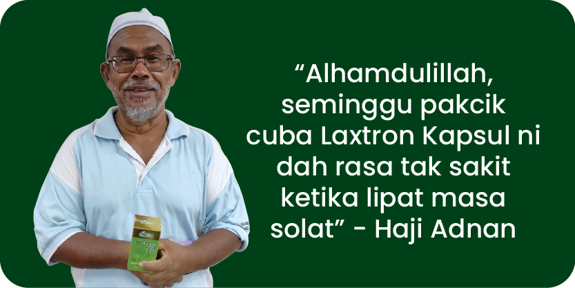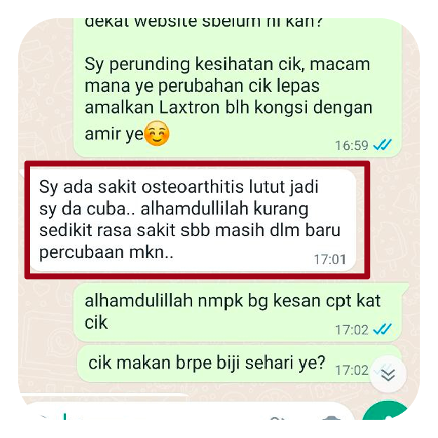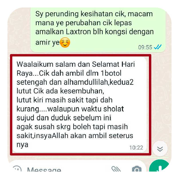 ***Ya Allah, berderai air mata acik selepas dapat dapat berjalan dengan normal balik...8 tahun derita sakit lutut sampai nak solat pun perlu duduk atas kerusi...Syukur sekarang dah boleh solat dengan sempurna, nak duduk antara 2 sujud pun dah tak sakit selepas 2 botol rawatan Laxtron Kapsul..." - Puan Aminah, Selangor